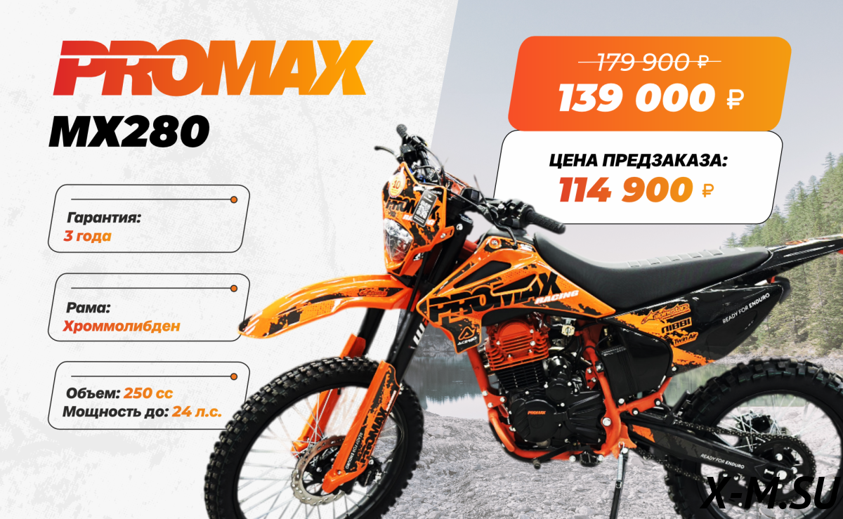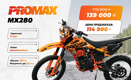 Новая модель PROMAX MX280 2024 модельного года для тех кто хочет больше! Больше скорости! Больше мощи! Больше адреналина! Встречайте PROMAX MX280 – покорителя бездорожья ! PROMAX MX280 - это выбор как продвинутых новичков, так и опытных райдеров. Мощный и надежный двигатель ZS 172FMM-3A (CB250-F) с воздушным охлаждением и 5-ступенчатой трансмиссией в паре со спортивным карбюратором NIBBI PE28 и выхлопом Akrapovic Exhaust System гарантируют приятный выхлоп, стабильную работу и мощность 24 л.с. Рычаг сцепления имеет флажок для легкого выжима сцепления и правильного положения троса для максимального комфорта и полного контроля работы двигателя.